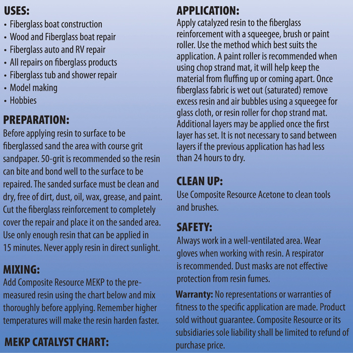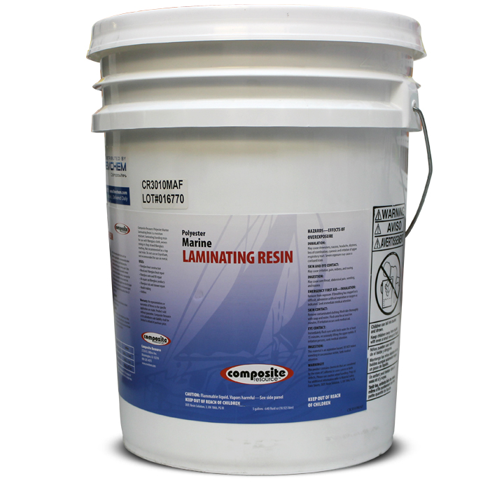 Composite Resource Polyester Marine Laminating Resin is a moisture resistant, laminating/bonding resin for use with fiberglass cloth, woven roving or chop strand fiberglass matting. Not recommended as a top coat resin. Do not use on Styrofoam, not recommended for use on metal.